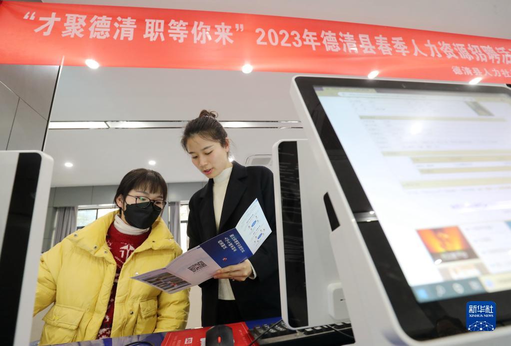 2月6日,在浙江省湖州市德清縣下渚湖街道舉辦的新春招聘會(huì )大學(xué)生專(zhuān)場(chǎng),應聘人員(左)在咨詢(xún)。