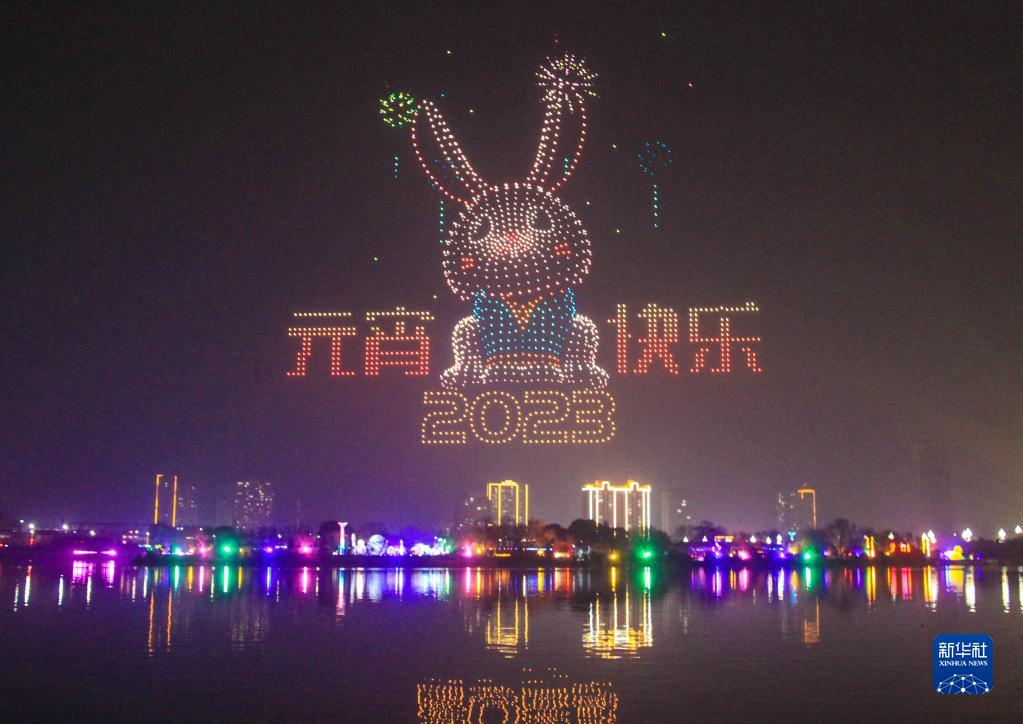 2月5日,河南省南陽(yáng)市中心城區,游客在觀(guān)看無(wú)人機編隊在夜空中組成的造型。