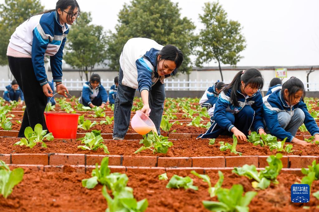 2月6日,江西省樟樹(shù)市義成鎮初級中學(xué)學(xué)生在校園農場(chǎng)給菜苗澆水。