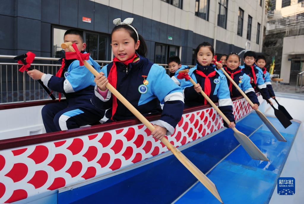 2月6日,湖北省宜昌市秭歸縣實(shí)驗小學(xué)學(xué)生在學(xué)校龍舟池里體驗劃龍舟。