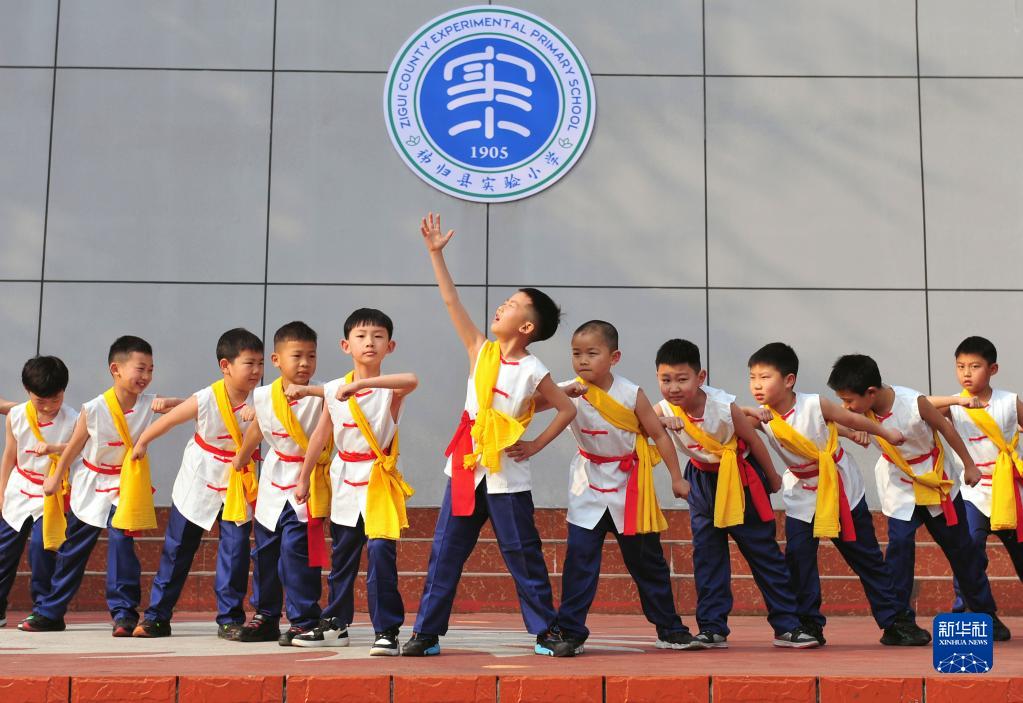 2月6日,湖北省宜昌市秭歸縣實(shí)驗小學(xué)學(xué)生表演獨具當地特色的《峽江船工號子》。