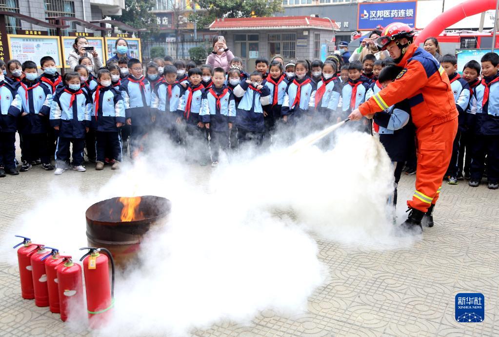 2月6日,在江蘇省連云港市墟溝小學(xué),消防救援人員教學(xué)生正確使用消防滅火器。