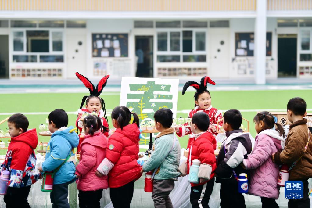 2月6日,安徽省阜陽(yáng)市阜南縣育新幼兒園,孩子們在校園內向同學(xué)打招呼。