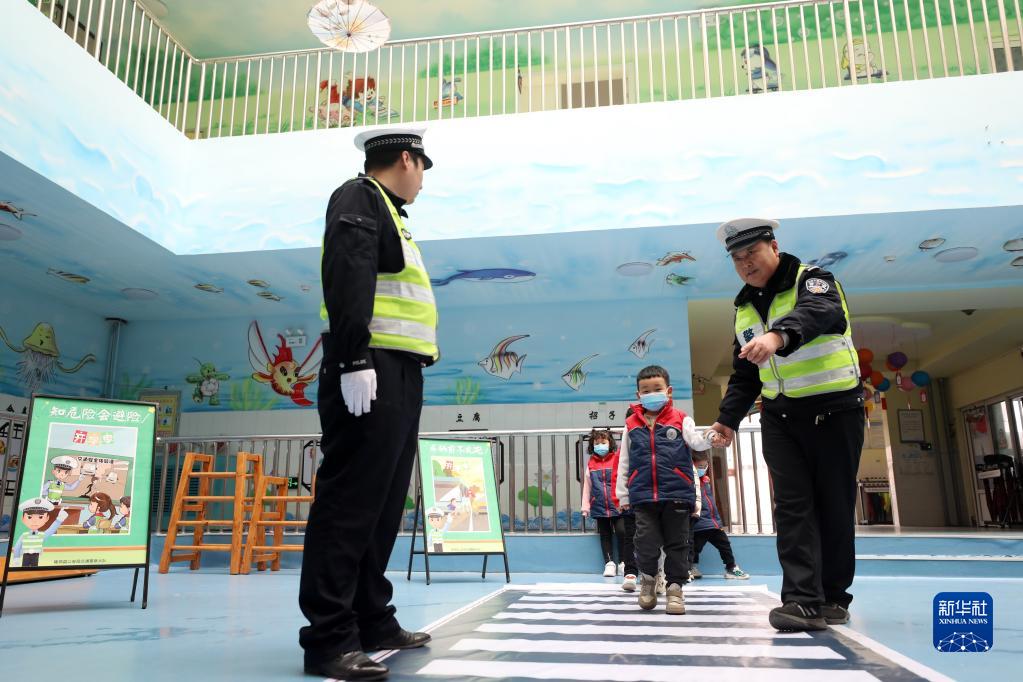 2月6日,在隆堯縣實(shí)驗幼兒園,交警帶領(lǐng)小朋友模擬過(guò)斑馬線(xiàn)。