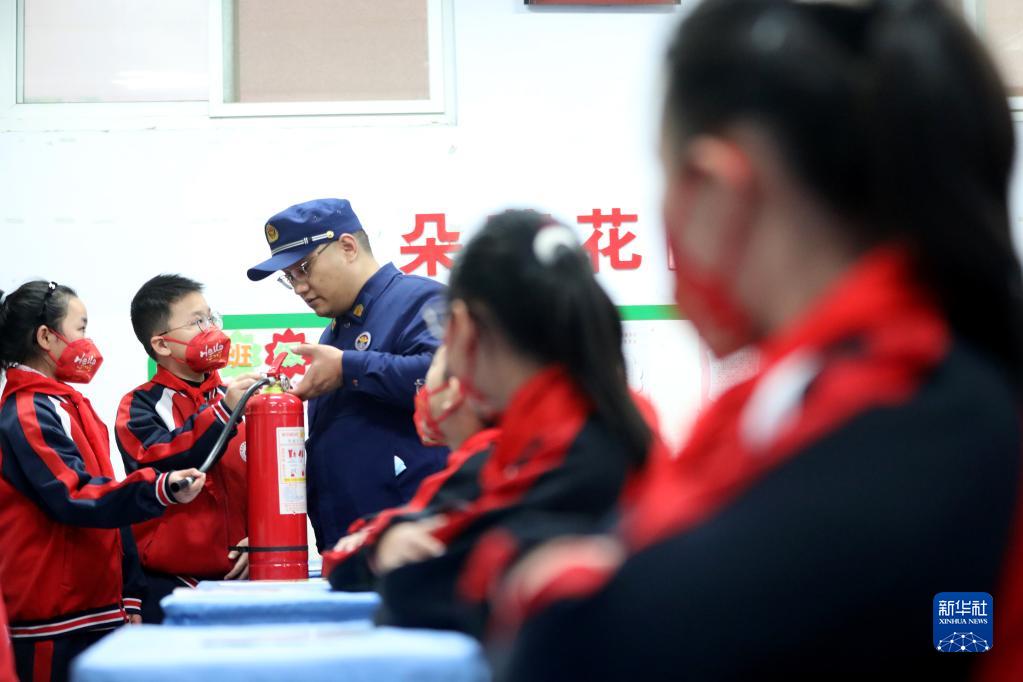2月6日,在隆堯縣第二實(shí)驗小學(xué),學(xué)生在消防救援人員指導下學(xué)習使用干粉滅火器。