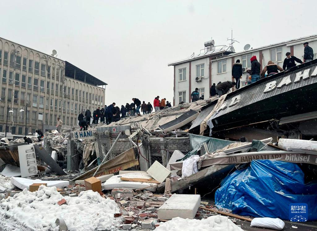 2月6日,人們聚集在土耳其馬拉蒂亞一處倒塌的建筑附近。