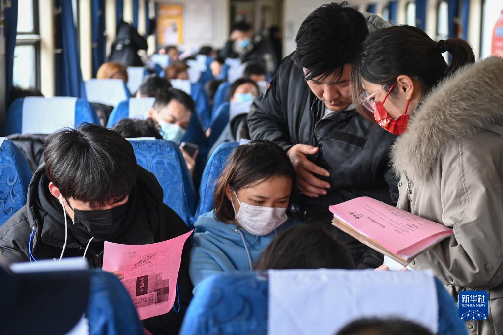 2月6日,企業(yè)代表在K210次列車(chē)上向旅客發(fā)放崗位信息。