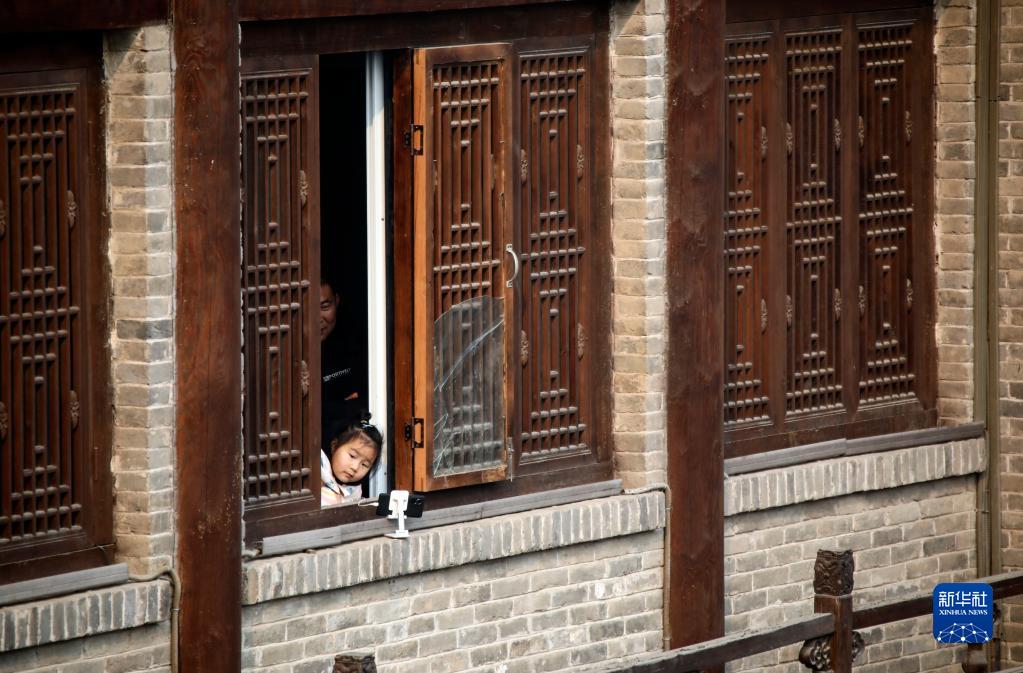 2月6日,小朋友在窗邊觀(guān)看廟會(huì )表演。