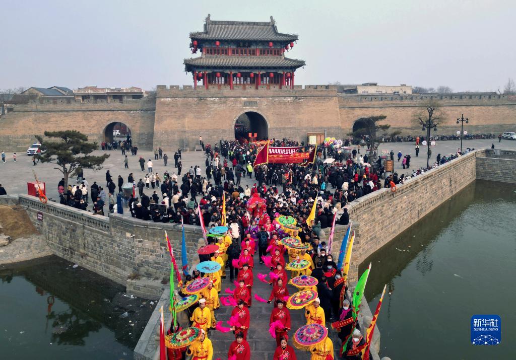 2月6日,社火團隊的演員在廟會(huì )上表演(無(wú)人機照片)。