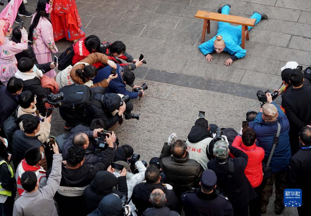 2月6日,社火團隊的演員在廟會(huì )上表演。