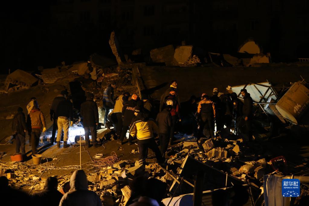 2月6日,救援人員在土耳其南部地震重災區卡赫拉曼馬拉什省帕扎爾哲克倒塌的建筑中搜尋幸存者。
