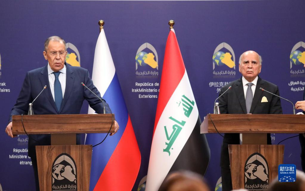 2月6日,在伊拉克首都巴格達,伊拉克外長(cháng)侯賽因(右)與到訪(fǎng)的俄羅斯外長(cháng)拉夫羅夫出席聯(lián)合新聞發(fā)布會(huì )。