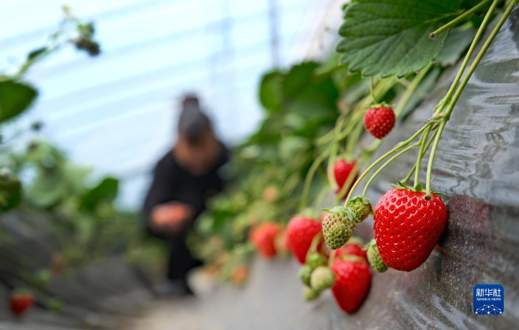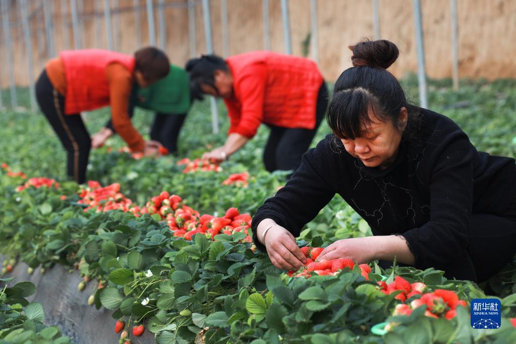 2月7日,農戶(hù)在陜西省渭南市合陽(yáng)縣路井鎮一家庭農場(chǎng)采摘草莓。