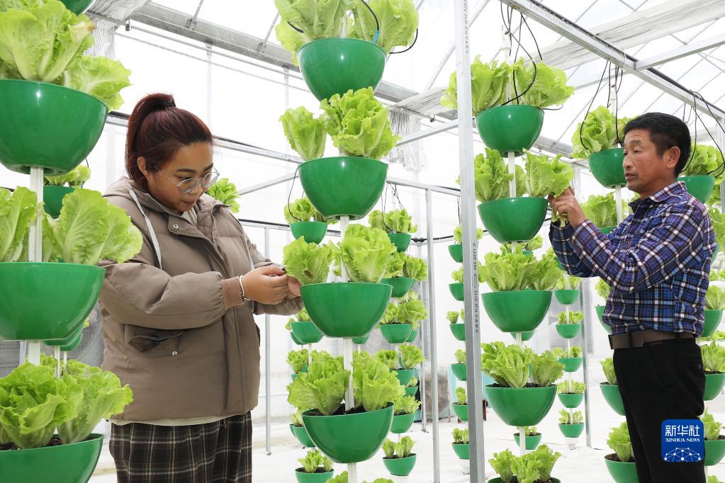 2月7日,在浙江省義烏市一蔬菜產(chǎn)業(yè)園,菜農查看無(wú)土栽培葉菜長(cháng)勢。