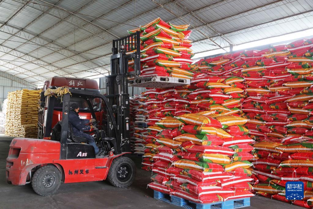 2月7日,在甘肅省定西市安定區一農資配送中心,工人操作叉車(chē)搬運農資。