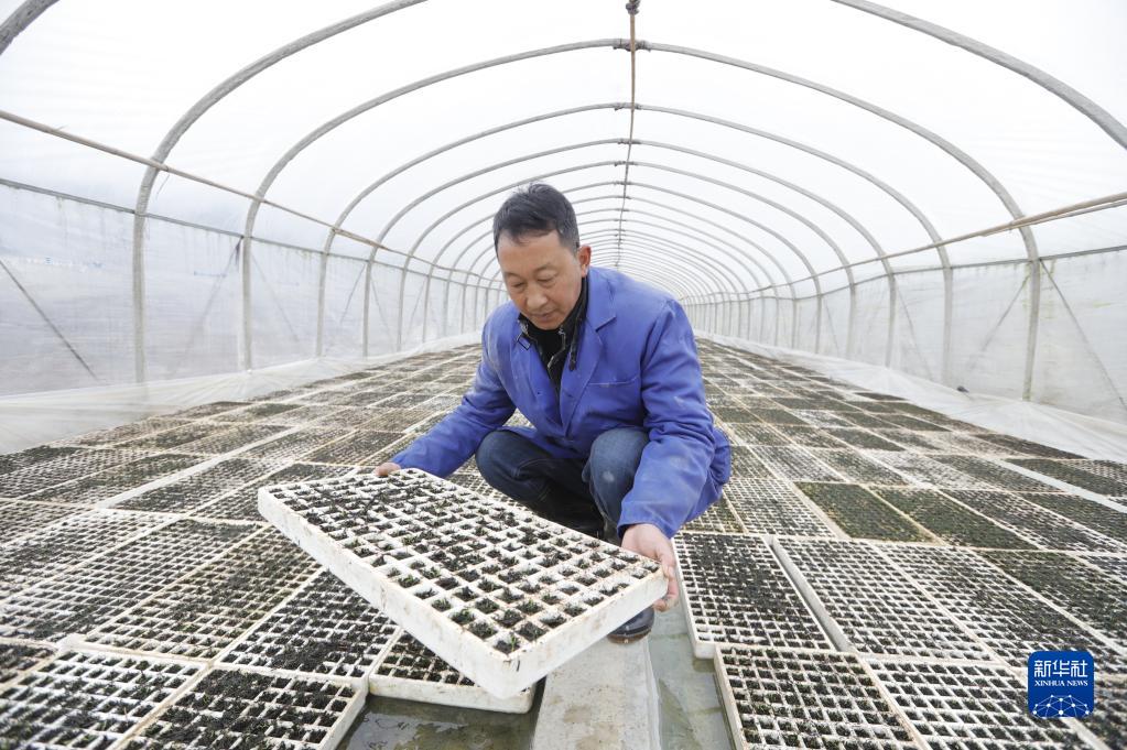 2月7日,在貴州省黔南布依族苗族自治州福泉市鳳山鎮竹王城村辣椒育苗基地,村民查看辣椒苗長(cháng)勢。