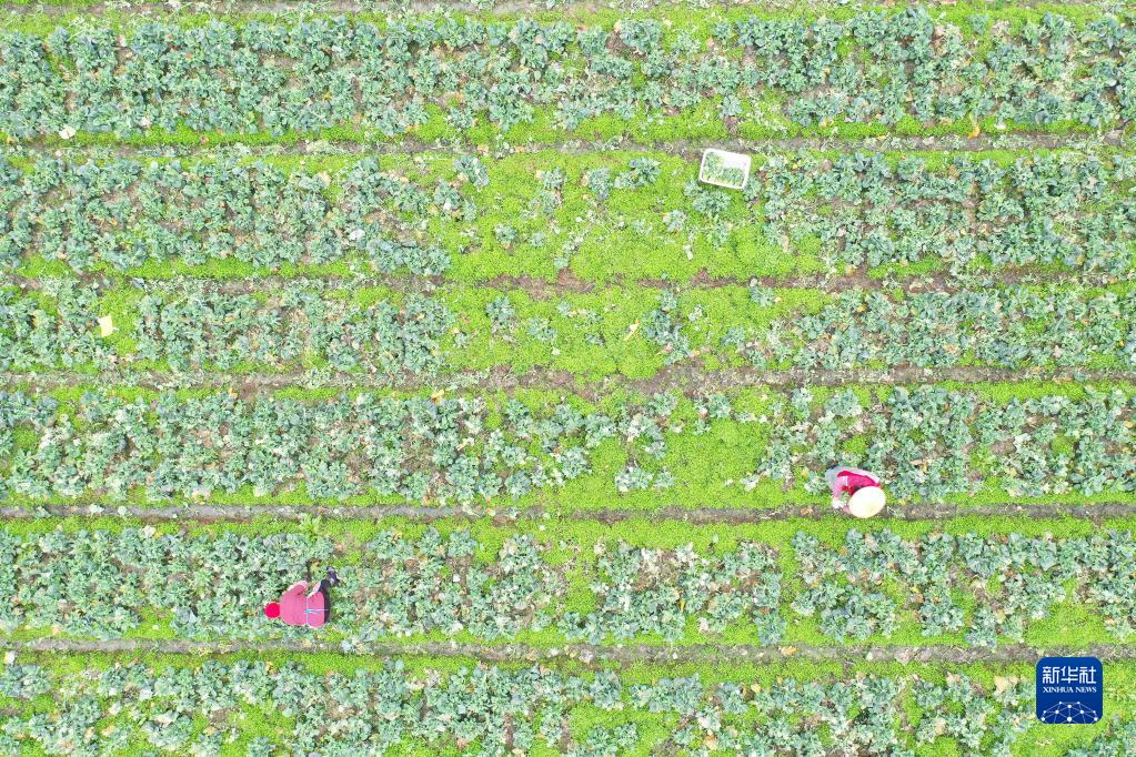 2月7日,在湖南省永州市道縣清塘鎮樓田村,村民在采摘蔬菜(無(wú)人機照片)。