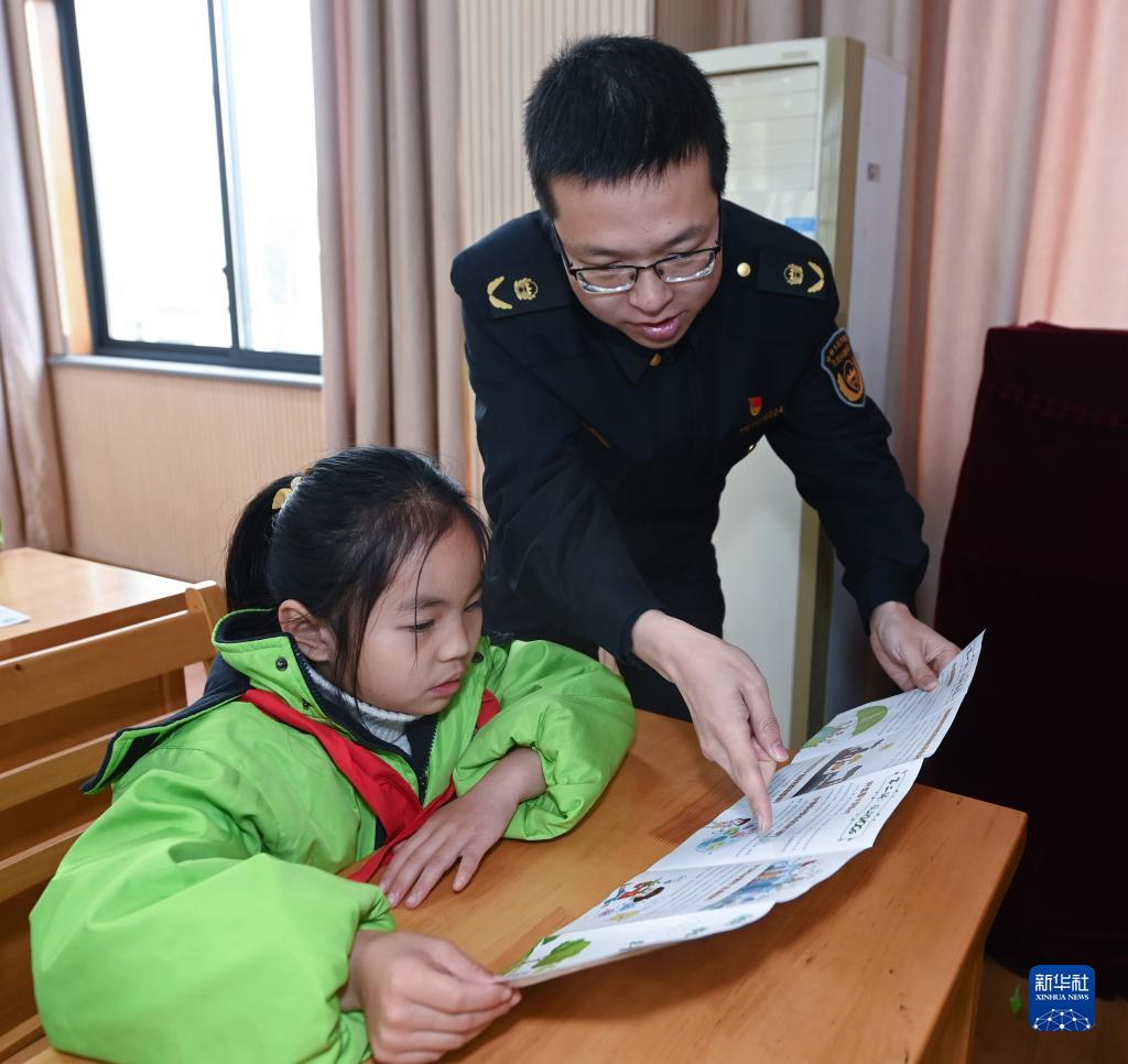 2月7日,杭州市生態(tài)環(huán)境局臨安分局的黨員志愿者在潛川小學(xué)向學(xué)生發(fā)放“無(wú)廢校園”宣傳單并講解。