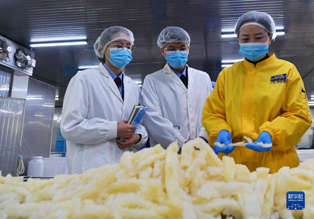 2月7日,在福建海文銘海洋科技發(fā)展有限公司預制菜生產(chǎn)線(xiàn),福州經(jīng)濟技術(shù)開(kāi)發(fā)區稅務(wù)局工作人員(左一、左二)在了解企業(yè)生產(chǎn)狀況。