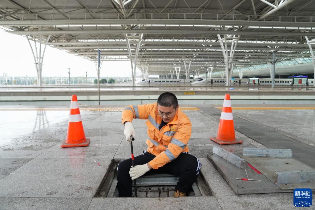2月7日,在上海虹橋火車(chē)站,上海房建公寓段工作人員在檢修站臺的地下式消火栓。