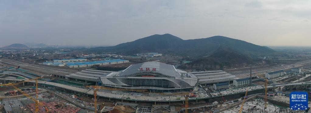 2月7日拍攝的江蘇南沿江鐵路江陰站站房(無(wú)人機照片)。