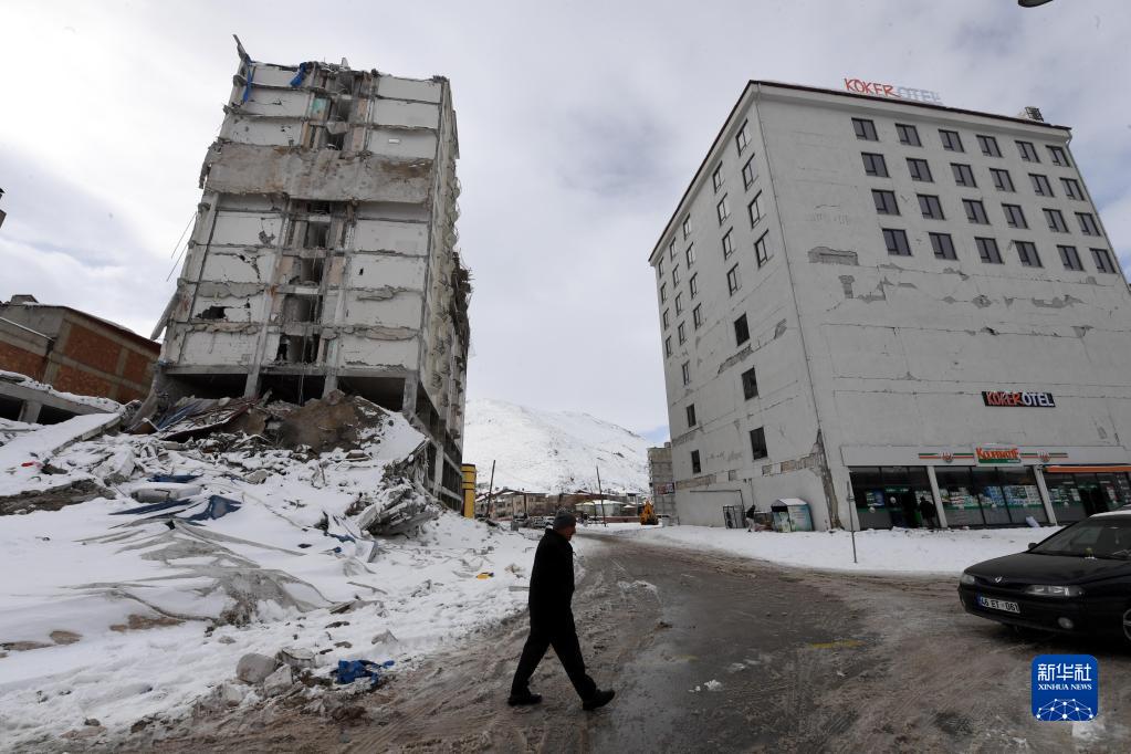 2月7日,在土耳其卡赫拉曼馬拉什省的埃爾比斯坦地區,一名男子經(jīng)過(guò)地震中受損的建筑物。