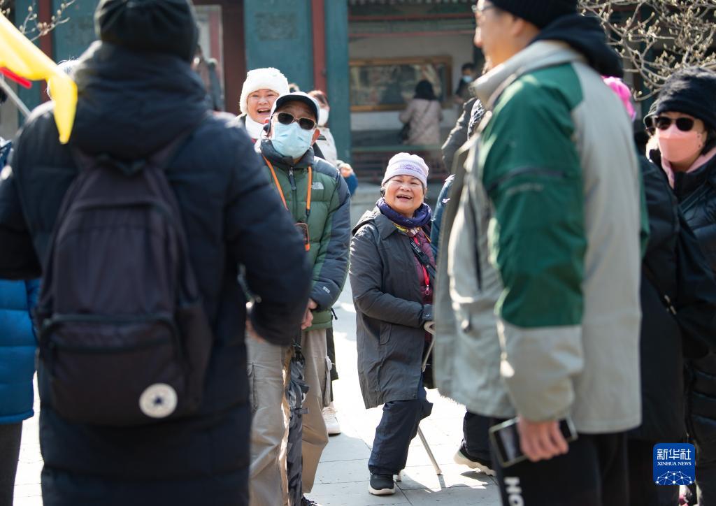 2月7日,香港游客李國麟(左三)與老伴兒陳翠華(左四)在頤和園聆聽(tīng)導游講解。