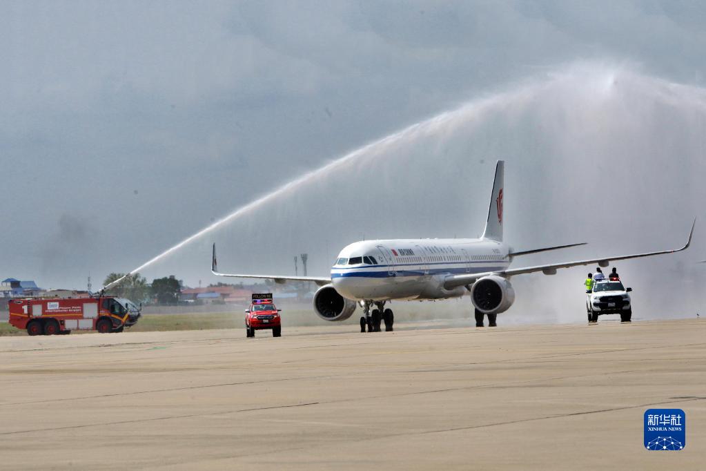 2月7日,國航航班在柬埔寨首都金邊國際機場(chǎng)接受水門(mén)禮。
