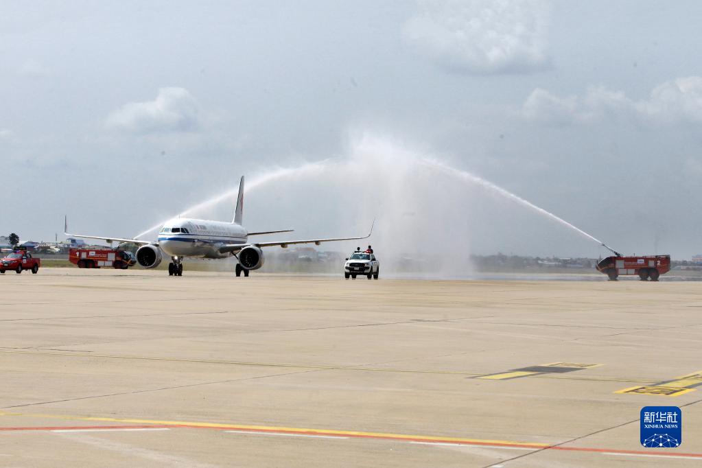 2月7日,國航航班在柬埔寨首都金邊國際機場(chǎng)接受水門(mén)禮。