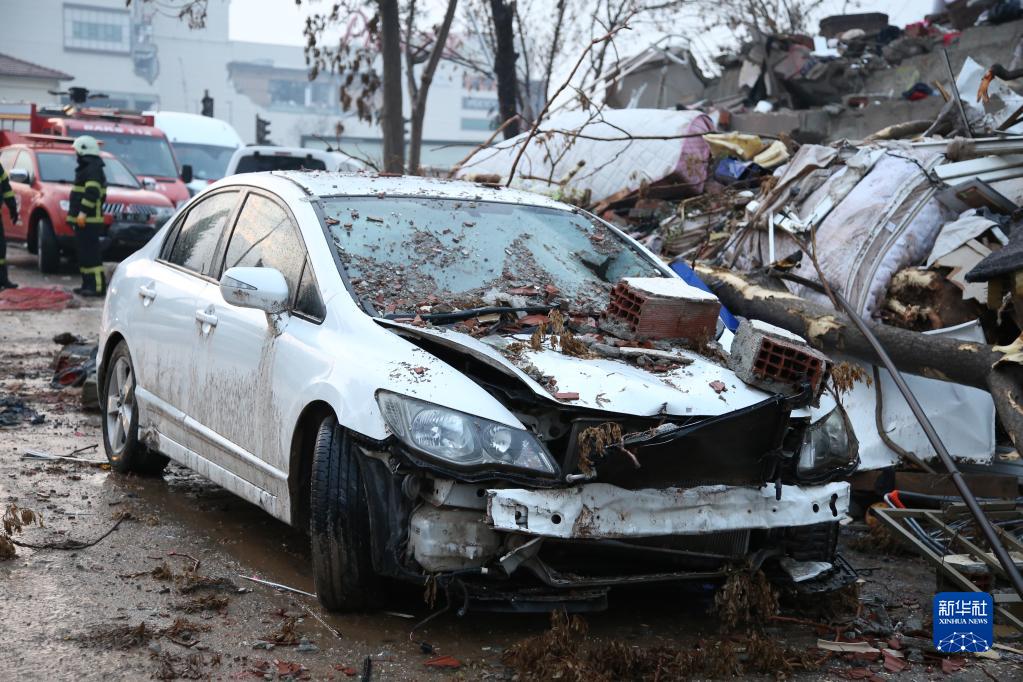 2月7日在土耳其南部卡赫拉曼馬拉什市市中心拍攝的受損的汽車(chē)??ê绽R拉什市是本次地震重災區卡赫拉曼馬拉什省省會(huì ),是遭受地震破壞最為嚴重的城市之一。