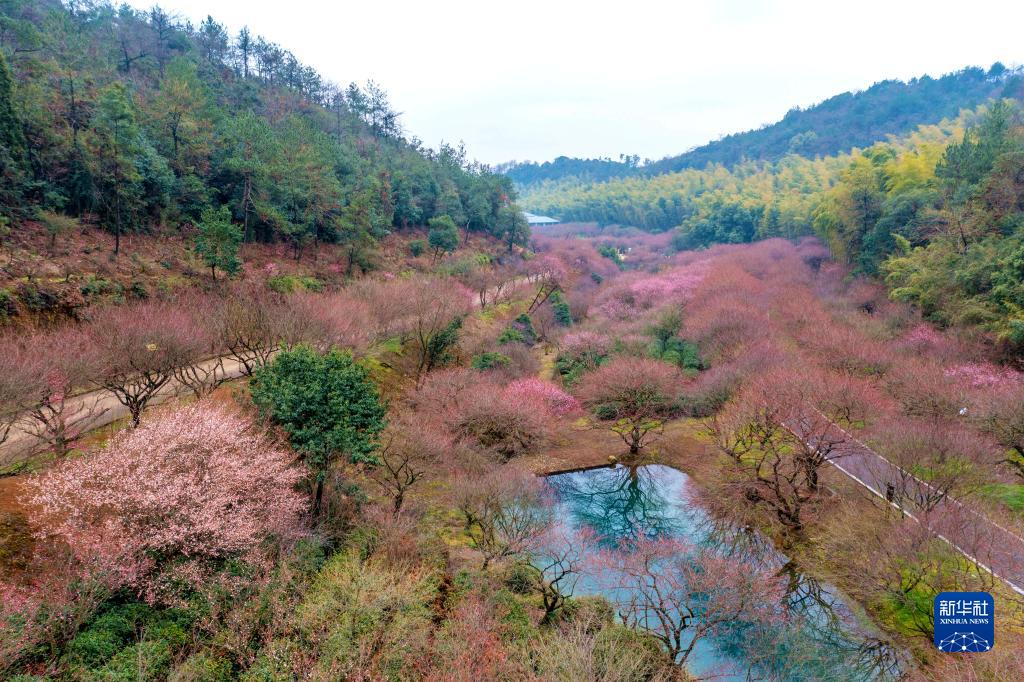 2月7日在浙江省湖州市長(cháng)興縣龍山街道東方梅園拍攝的梅花(無(wú)人機照片)。