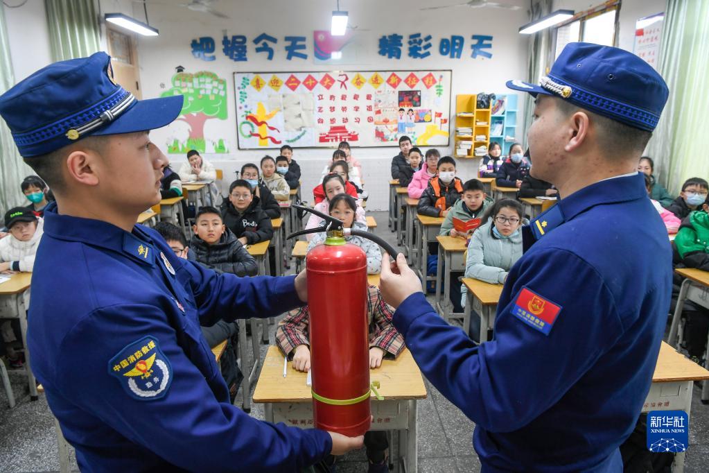 2月8日,在四川省廣安市廣安區思源小學(xué)6年級7班,消防員向學(xué)生講解滅火器的使用技巧。