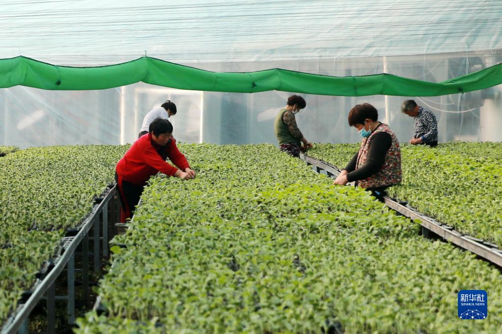 2月8日,農民在安徽省淮北市濉溪縣五鋪村育苗基地的大棚內管理果蔬幼苗。