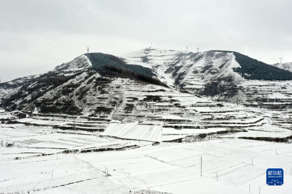 這是2月8日在甘肅省定西市岷縣境內拍攝的春日雪景(無(wú)人機照片)。
