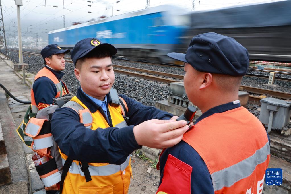 2月8日,貴陽(yáng)電務(wù)段工作人員在上道前調試北斗防護系統設備。