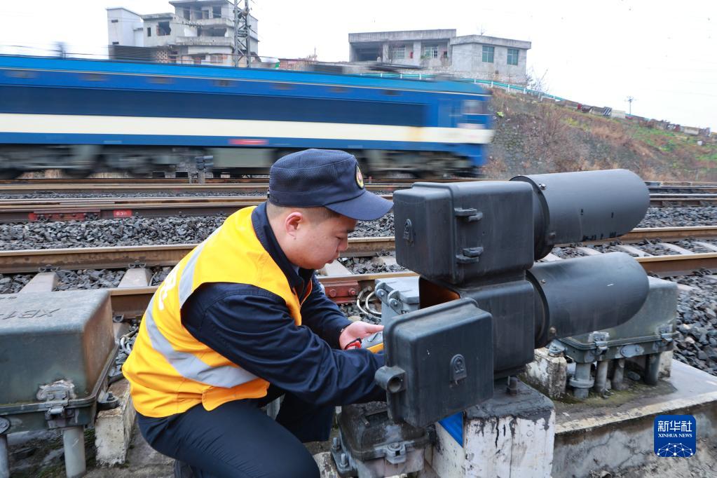 2月8日,貴陽(yáng)電務(wù)段工作人員攜帶著(zhù)北斗防護系統設備進(jìn)行作業(yè)。