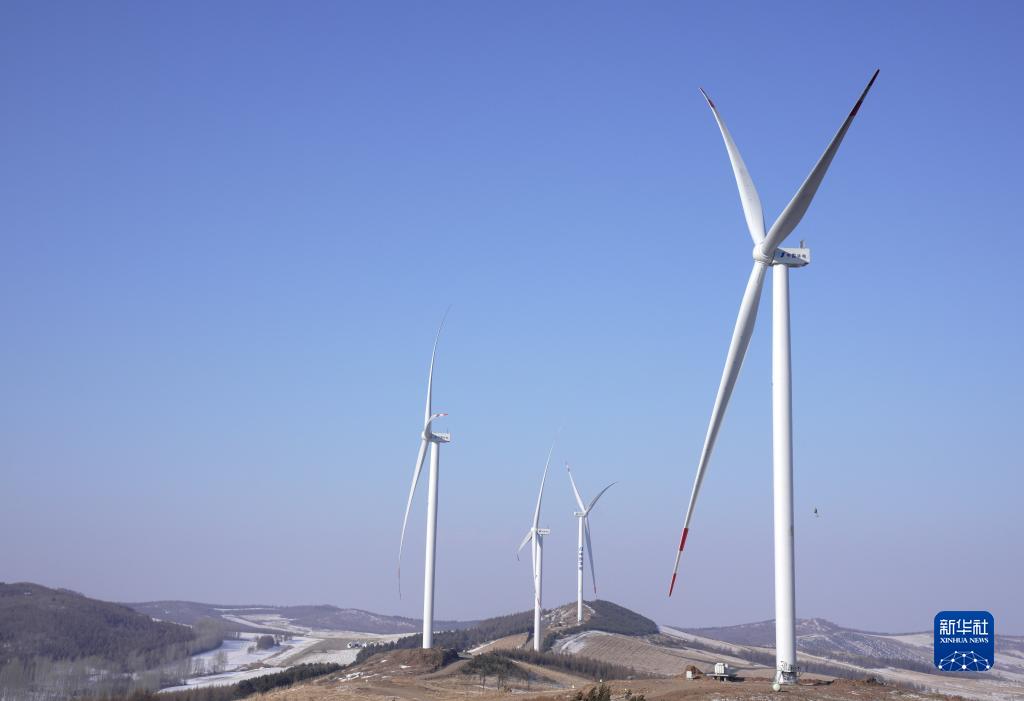 2月7日拍攝的華電黑龍江區域哈爾濱依蘭雞冠山風(fēng)電場(chǎng)三期工程部分運行的風(fēng)電機組。
