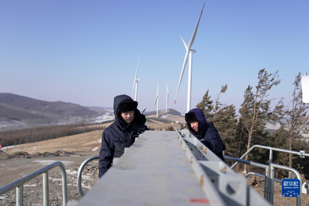 2月7日,在華電黑龍江區域哈爾濱依蘭雞冠山風(fēng)電場(chǎng)三期工程一處運行的風(fēng)電機組,工作人員在進(jìn)行巡檢。