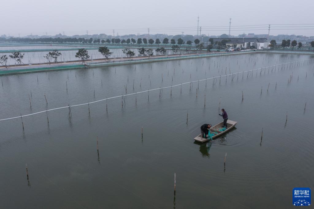 2月8日,湖州市織里鎮喬溇村的太湖蟹養殖戶(hù)把太湖蟹苗放入養殖塘內(無(wú)人機照片)。
