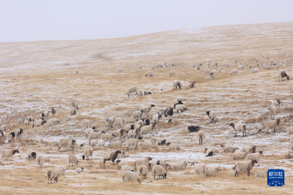 2月8日,在祁連山北麓的甘肅山丹馬場(chǎng),羊群在雪中覓食。