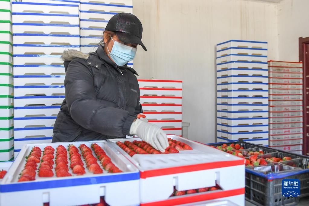 2月7日,在梨樹(shù)縣梨樹(shù)鎮九九香農業(yè)有限責任公司,農民將剛采摘的草莓分等包裝。