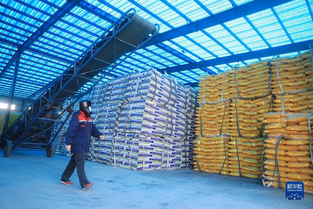 2月6日,在鐵嶺縣愛(ài)爾法農業(yè)科技(遼寧)有限公司倉庫,工人在查看化肥儲存情況。