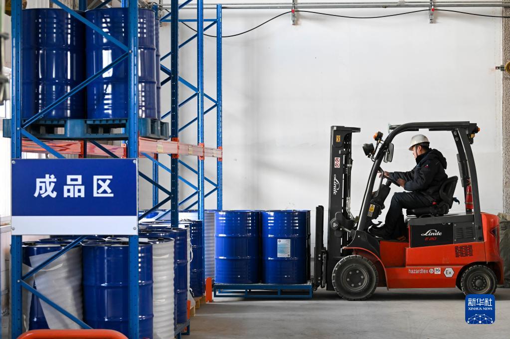 2月8日,在天津長(cháng)蘆化工新材料公司,工人操作叉車(chē)運輸產(chǎn)品。