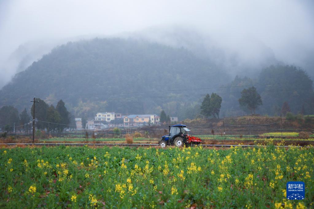 2月8日,貴州省龍里縣灣灘河鎮走馬村農民駕駛農機在田里翻耕土地。