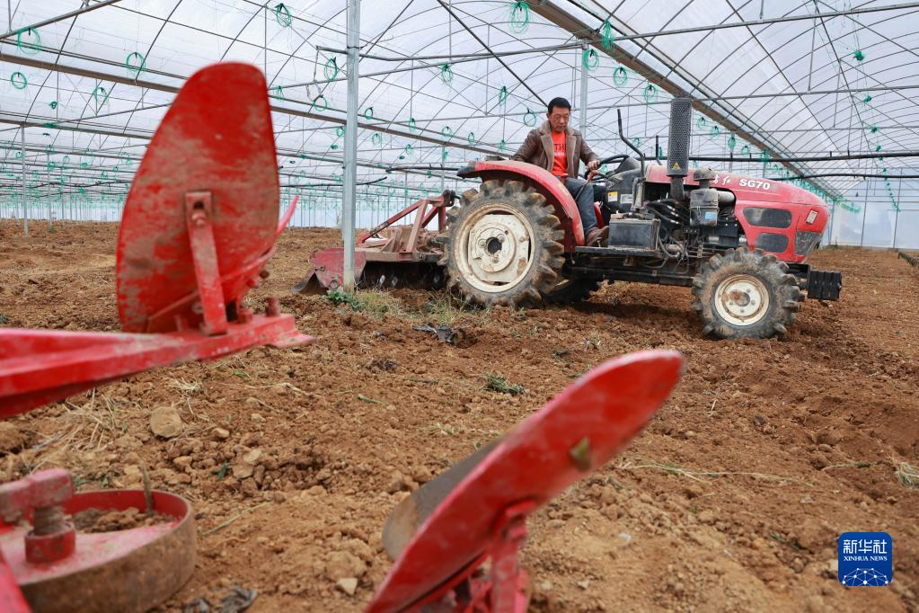 2月8日,貴州省龍里縣灣灘河鎮園區村村民駕駛農機在大棚里翻耕土地。