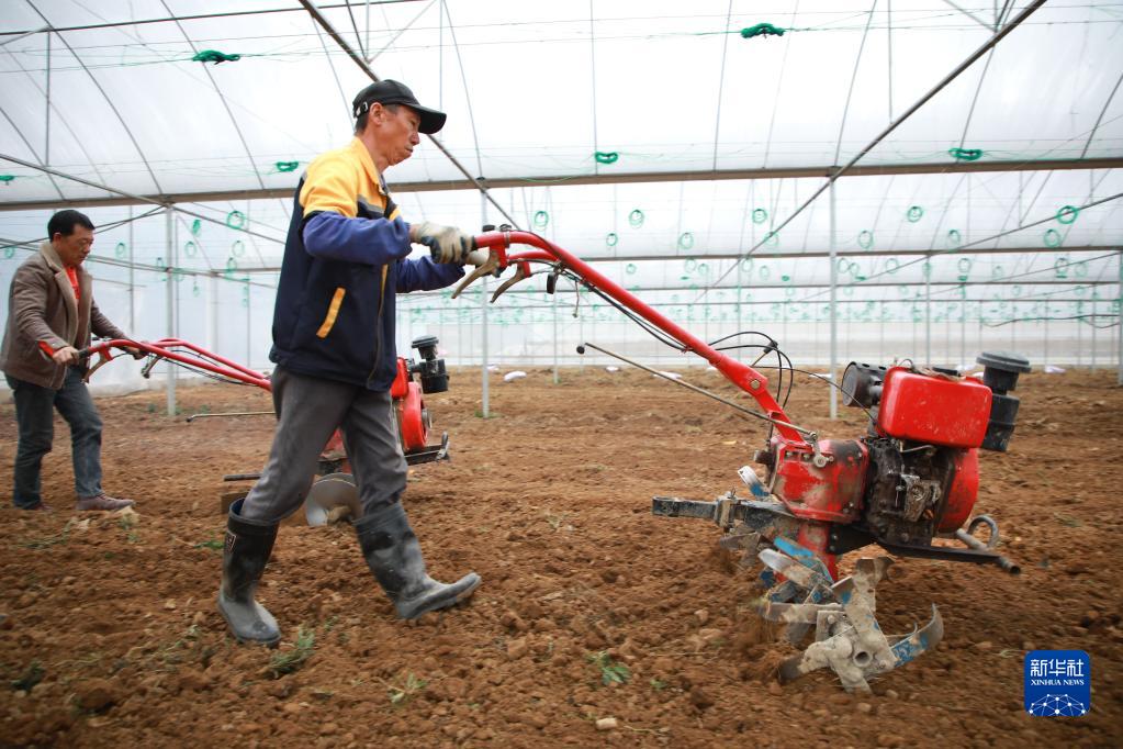 2月8日,貴州省龍里縣灣灘河鎮園區村村民使用小型農機在大棚里翻耕土地。