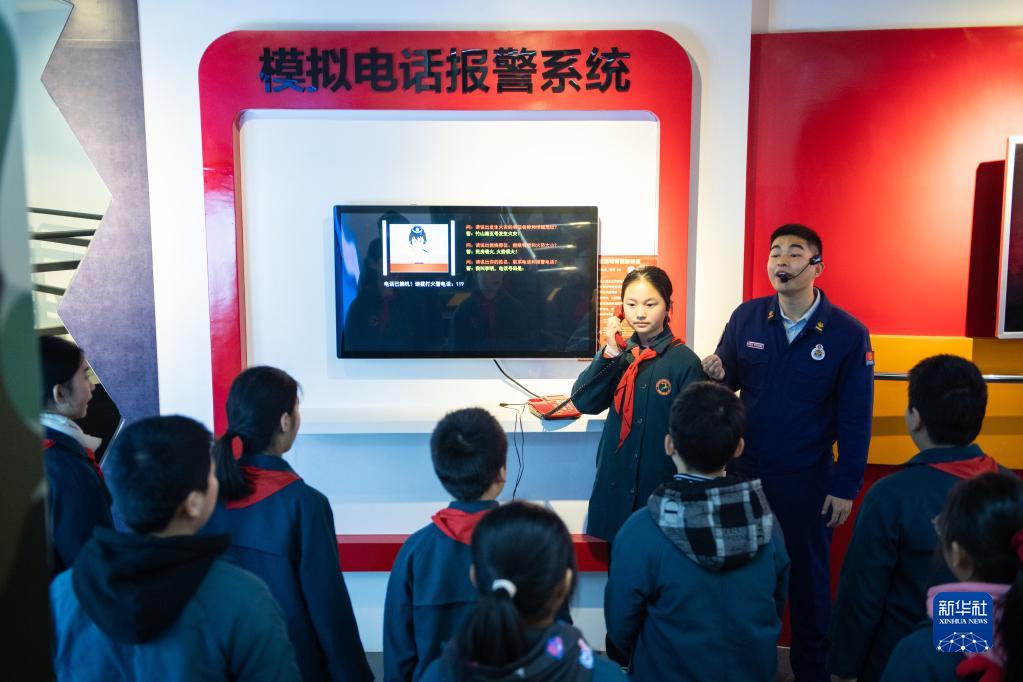 2月8日,在常德市武陵區第一小學(xué)安全教育館,消防隊員指導學(xué)生在“火情”發(fā)生后報警。