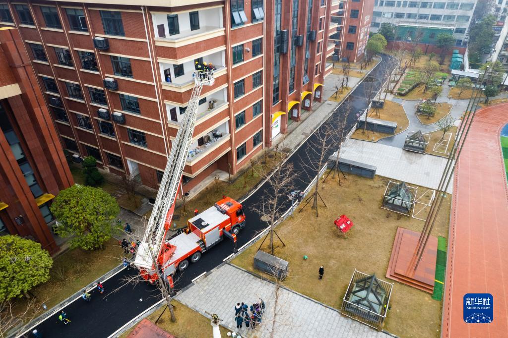 2月8日,在常德市武陵區第一小學(xué)教學(xué)樓,消防隊員在進(jìn)行高空營(yíng)救被困學(xué)生演練(無(wú)人機照片)。