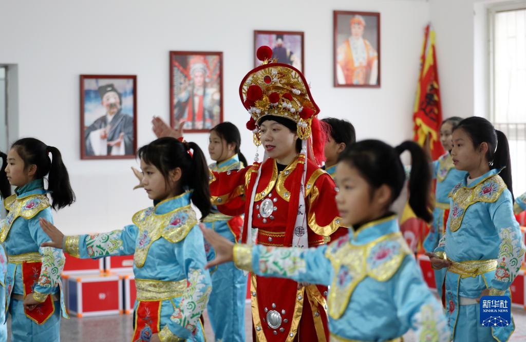 2月7日,在湖南省資興市鯉魚(yú)江完全小學(xué),戲曲老師指導學(xué)生學(xué)習戲曲表演基本動(dòng)作。