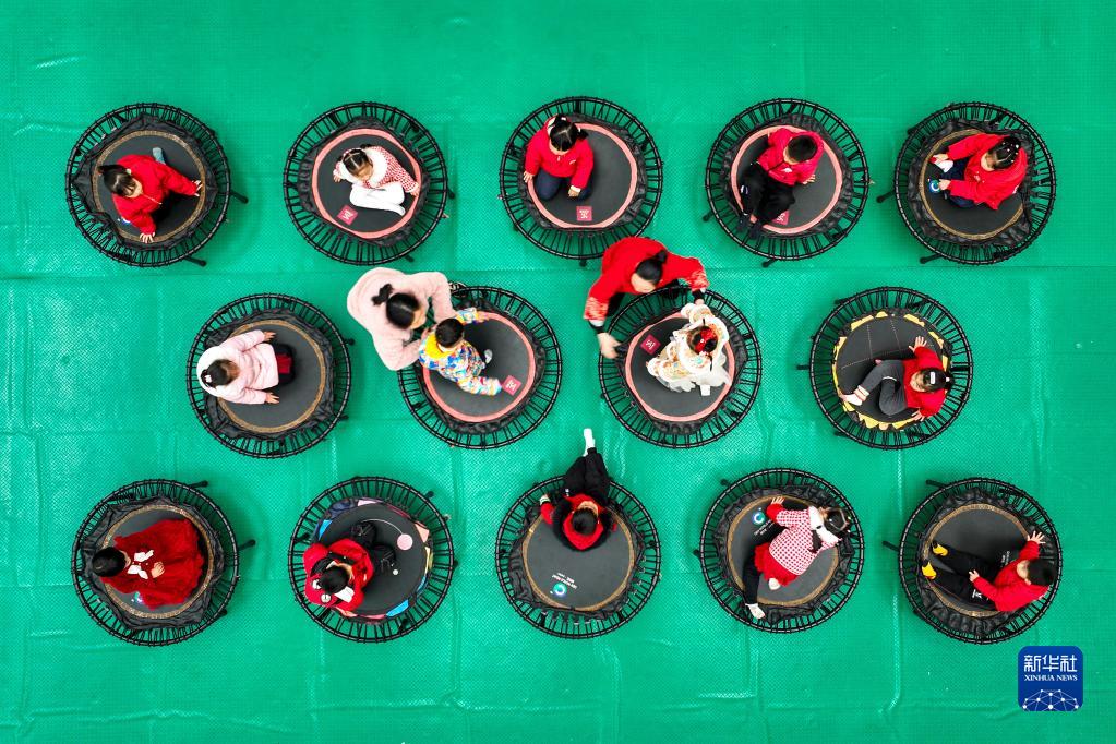 2月8日,浙江省寧波市鎮海區澥浦鎮中心幼兒園的老師指導孩子們進(jìn)行蹦床訓練(無(wú)人機照片)。